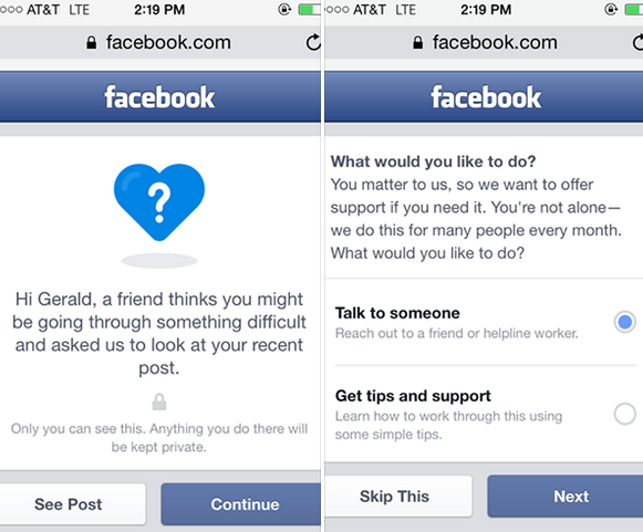 Facebook also worked with its clinical and mental health partners to increase the immediate support and resources available to a user logging back into the site for the first time since posting content which was flagged for review. Members will be given advice on “working through these feelings” and encouraged to connect with an expert at the National Suicide Prevention Lifeline or a friend. Users who flag a post will also be prompted to “call or message their distressed friend letting them know they care” or reach out to “another friend or a trained professional at a suicide hotline for support.”