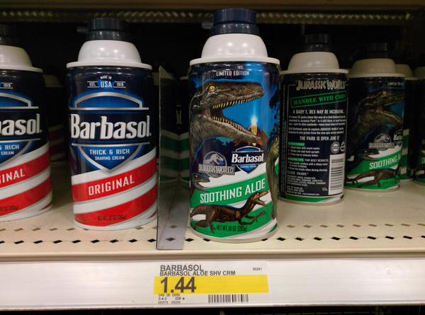Well, now you can shave your face and think of dinosaurs all the time with these new limited edition tie-in cans (which are probably full of shaving cream, and not dino DNA, tragically). You totally killed it with this marketing, Jurassic World.