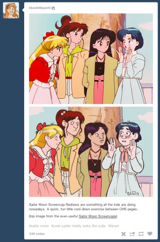 One of the coolest Sailor Moon projects I’ve seen on the Internet is a quiet trend on Tumblr of artists taking a screenshot from the anime and redrawing it into their own style. This phenomenon has since spread to other fandoms and I’m not even totally sure if it originated with Sailor Moon in the first place, but it’s kind of fantastic.