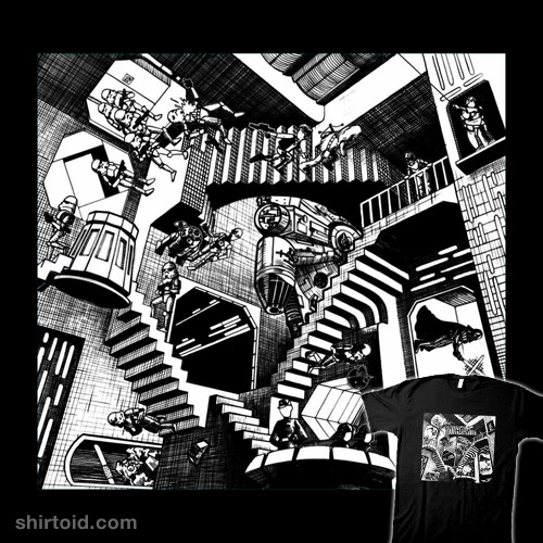 Dark Side, Light Side. It’s all relative. Via Fashionably Geek, this Star Wars version of M.C. Echer‘s Relativity is available in t-shirt form at Super7.