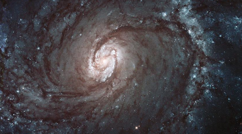 From NASA: “This Hubble Space Telescope image of M100 was made in 2009 and reveals bright blue star clusters and intricate winding dust lanes which are hallmarks of this class of galaxies… If you know exactly where to look, you can find a small spot that is a light echo from a bright supernova that was recorded a few years before the image was taken.” (via io9)
