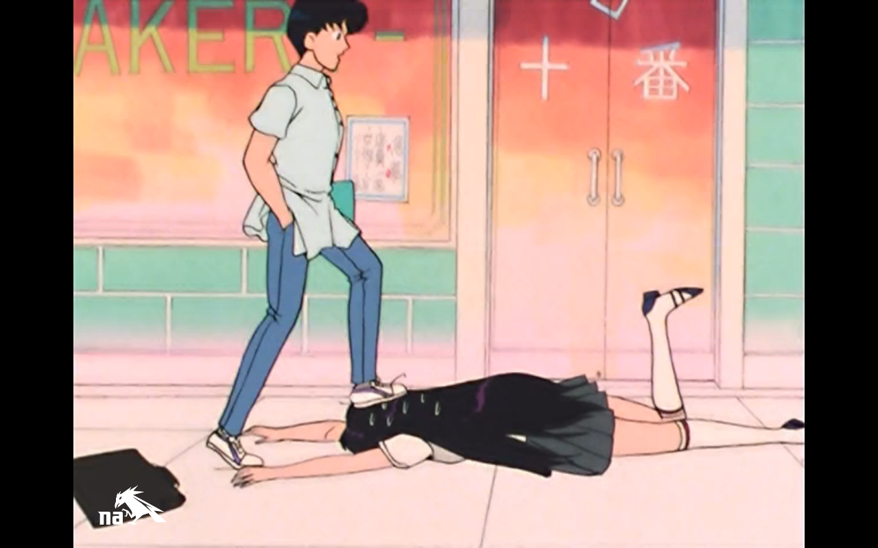 But speaking of animalistic urges, Rei has a perfect plan to catch Mamoru: run into him so hard that he feels sorry for her and takes her out for coffee. From across the street, Usagi notices the situation just in time for Rei to trip at exactly the right moment for Mamoru to step on her head. And yet, even though the fault in this situation is clearly with Rei, and even though he recognizes her as one of Usagi’s friends, she still manages to turn it into going out for coffee because she knows what she wants and she gets it, dang it. Obviously jealous, Usagi tails them to the coffee place, ostensibly to protect Rei from that jerk Mamoru. She hasn’t enough money to go inside after them, though, until Umino shows up and she makes a bad decision: pretend to be on a date with him in order to take advantage of his pocket money. NO, Usagi, BAD.