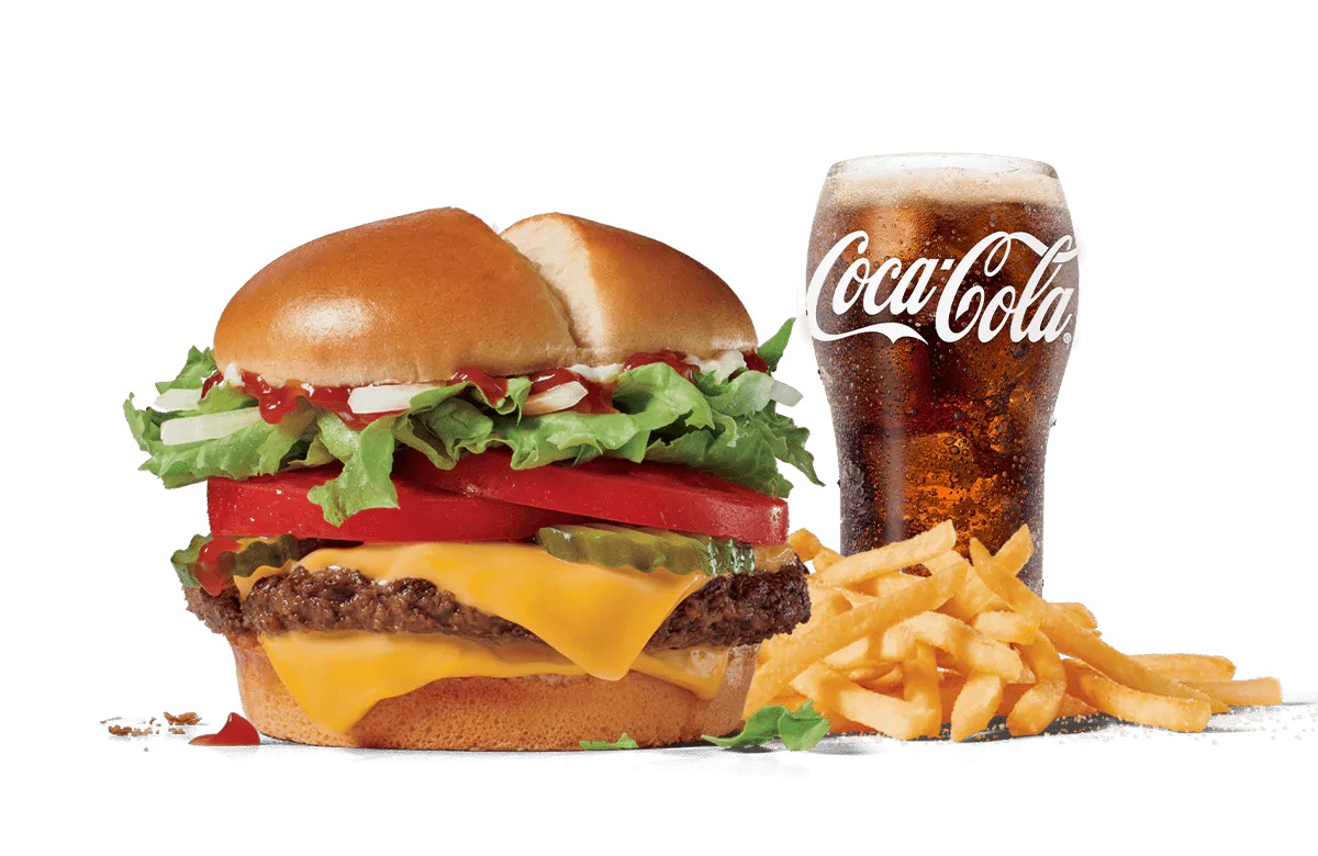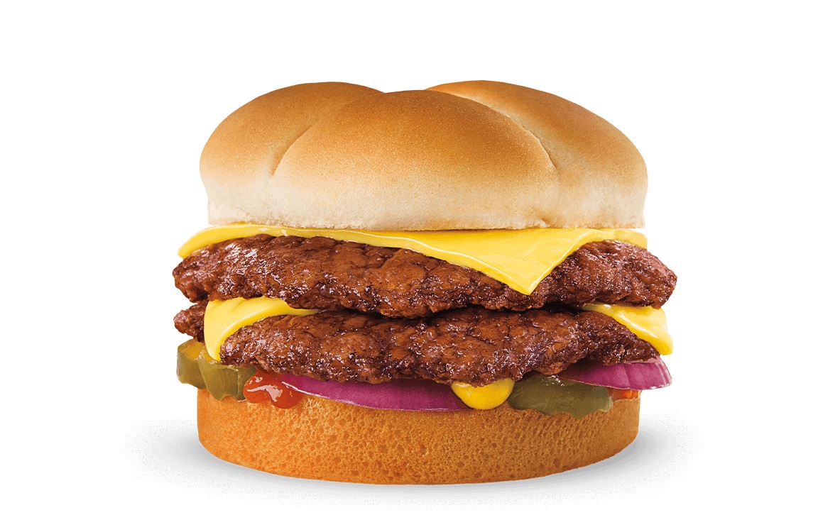 Packed with flavor, the Double Western Bacon Cheeseburger is composed of two charbroiled beef patties, two strips of bacon, two crispy onion rings, American cheese, and BBQ sauce. Yum!