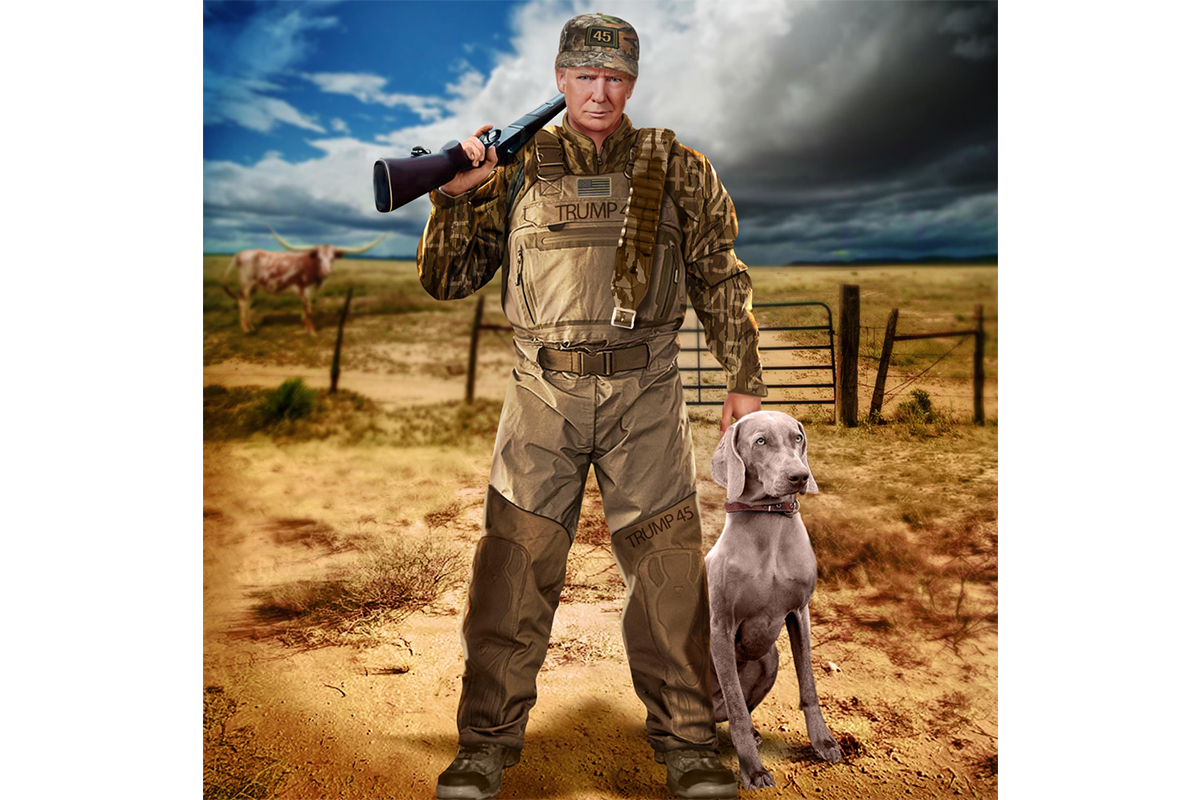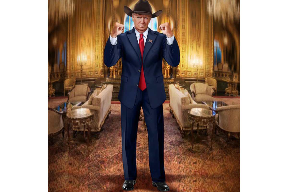 Again, this man was born and raised in New York. But I do love how small they still made his feet in this picture. I guess Trump World floats above the earth because he’s standing in the sky in a knockoff look from whatever western you love most. (I love Hell or High Water but no one in that movie dressed like this nonsense.) He’s standing in front of a sign that says Trump World but it’s supposed to be the “Hollywood” sign? I don’t know how that makes sense but then again, I have braincells so maybe that’s why it’s not working for me.
