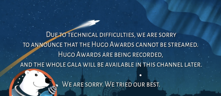 It’s unfortunate that the official Hugo Awards stream isn’t functional, but their YouTube channel does say the whole gala is being filmed and will be available there later. You can also watch live text updates on the Hugo Awards website. And if you’re in the mood for some drama, check out the livechat currently happening on the official YouTube streaming page.
