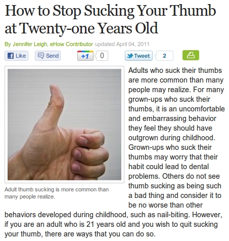 When you find yourself wanting to suck your thumb, pull out a lollipop or toothpick and suck or chew on it instead. Do this for a few weeks until you are comfortable not sucking your thumb. At this time begin to wean yourself off the lollipops or toothpicks by using them less and less.
