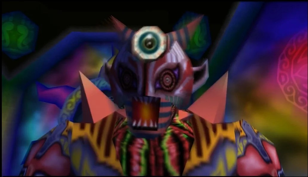 The final boss from Majora’s Mask is a deeply unsettling affair. After collecting all the magical masks in the world and facing down Skull Kid on top of Clock Town’s clocktower, you are transported to the surface of the moon which doesn’t actually look like the moon at all but rather a peaceful green field with a tree in the center. Under the tree you find children wearing creepy masks who ask you to play games with them. One child is sitting alone under the tree, away from all the others. He is wearing the evil Majora’s Mask, and is no doubt the spirit of Majora incarnate. He asks you to play a game of “good guys versus bad guys” and that “you’re the bad guy.” Then he transports you to a technicolor hellscape where you realize that Majora is not a “he” at all, but an “it.” Majora’s Mask floats in front of you, and grows gross tentacles that you have to destroy. Then it changes form and grows an eye and legs and starts running around at sonic speeds while laughing maniacally. You give it a couple of good licks with your sword and then it changes form again into a vaguely humanoid shape with tentacle whips and at this point, you black out from screaming and come to and hopefully, Majora is dead. But it doesn’t die. Because it lives on in your nightmares, forever.