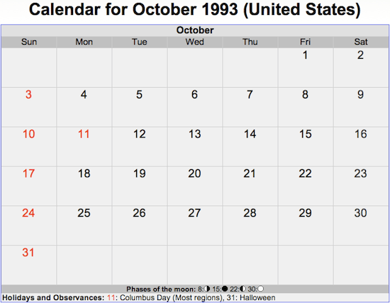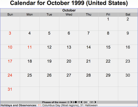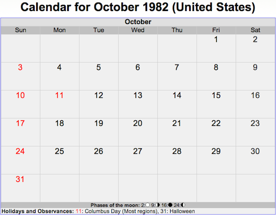 And here are the calendars for October 1982, October 1993, October 1999, and October 2021. See a pattern?
