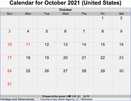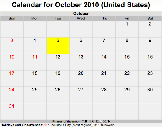 Here’s the 2010 October calendar, via TimeandDate.com: (today’s date is highlighted in yellow)