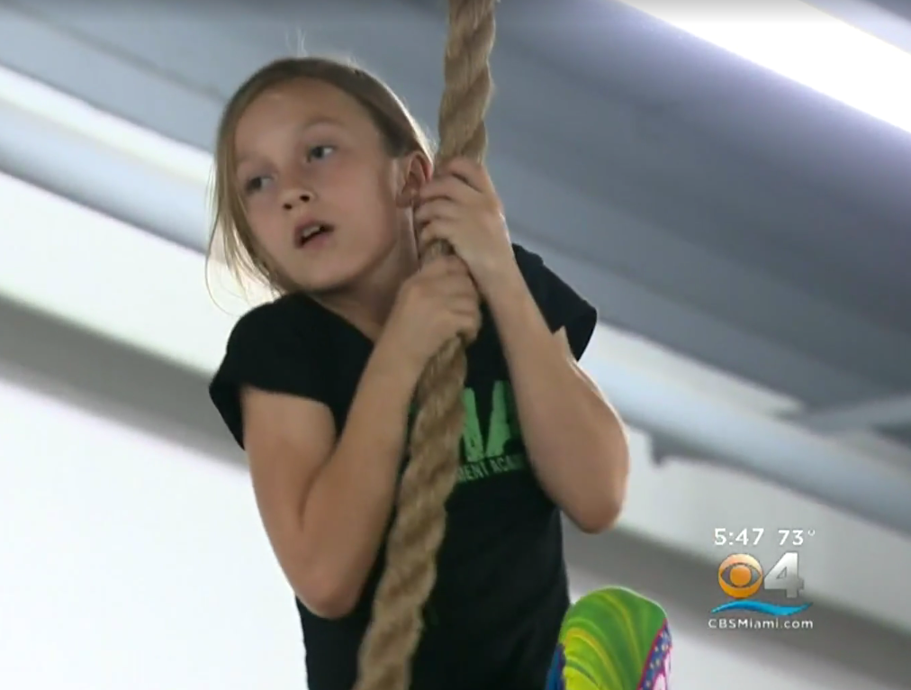 I train people for obstacle course racing. She’s come to a couple races before — a few Spart-races, a few Battlefrogs, Down & Dirty — and run the kids’ course. It wasn’t a challenge for her. We asked Battlefrog if she could run the full elite course with me for the 15k in November. She missed one obstacle; she missed the rig on her second lap, only ’cause she slipped. She had no issues with any of the obstacles.