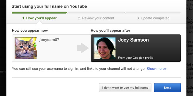 Although Google has already implemented a Google-wide identity for new users of YouTube, existing users were unable to consolidate their digital identities. Now, Google will encourage all users to link up their existing YouTube accounts with their Google+ accounts: “If you are currently YouTube user joeysam87, you can now appear as Joey Samson, the full name from your Google+ profile (with an actual space in the middle!), along with any photo you uploaded.” When you switch your account over, you’ll be able to review your content, meaning that you have to option to look over “every video, comment or playlist you’ve ever posted, and decide whether you want it associated with your full name before making the change.”