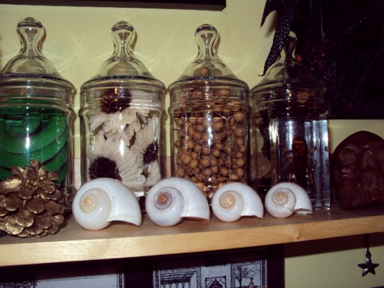 Logospilgrim desribes the space as a mix of the Addams Family mansion and Pee Wee’s Playhouse and says she’s slowly built up her collection. “A set of jars here, a couple of rubber snakes there, cockroaches, a heart, spiders, eyeballs, shells, stones, herbs, crystals… Most of what I have collected has been rather inexpensive.”