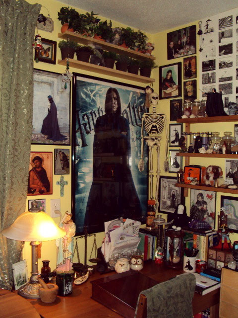 Logospilgrim has written about Snape often including the essay, The Severus Snape Paradigm: Outcast, Rebel, Hero. She also cosplays as the character frequently, has a Snape tattoo and her living space, nicknamed “the dungeon” is apparently something of legend. The editor of Offbeat Home asked Logospilgrim to document it for the world to see and she oblidged. We are very thankful.