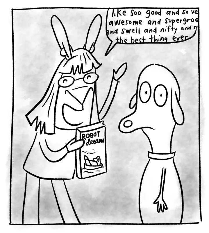 ME: Your work is just, like, the most AWESOME STUFF EVER! The first time I read ROBOT DREAMS I practically wept with jealousy!