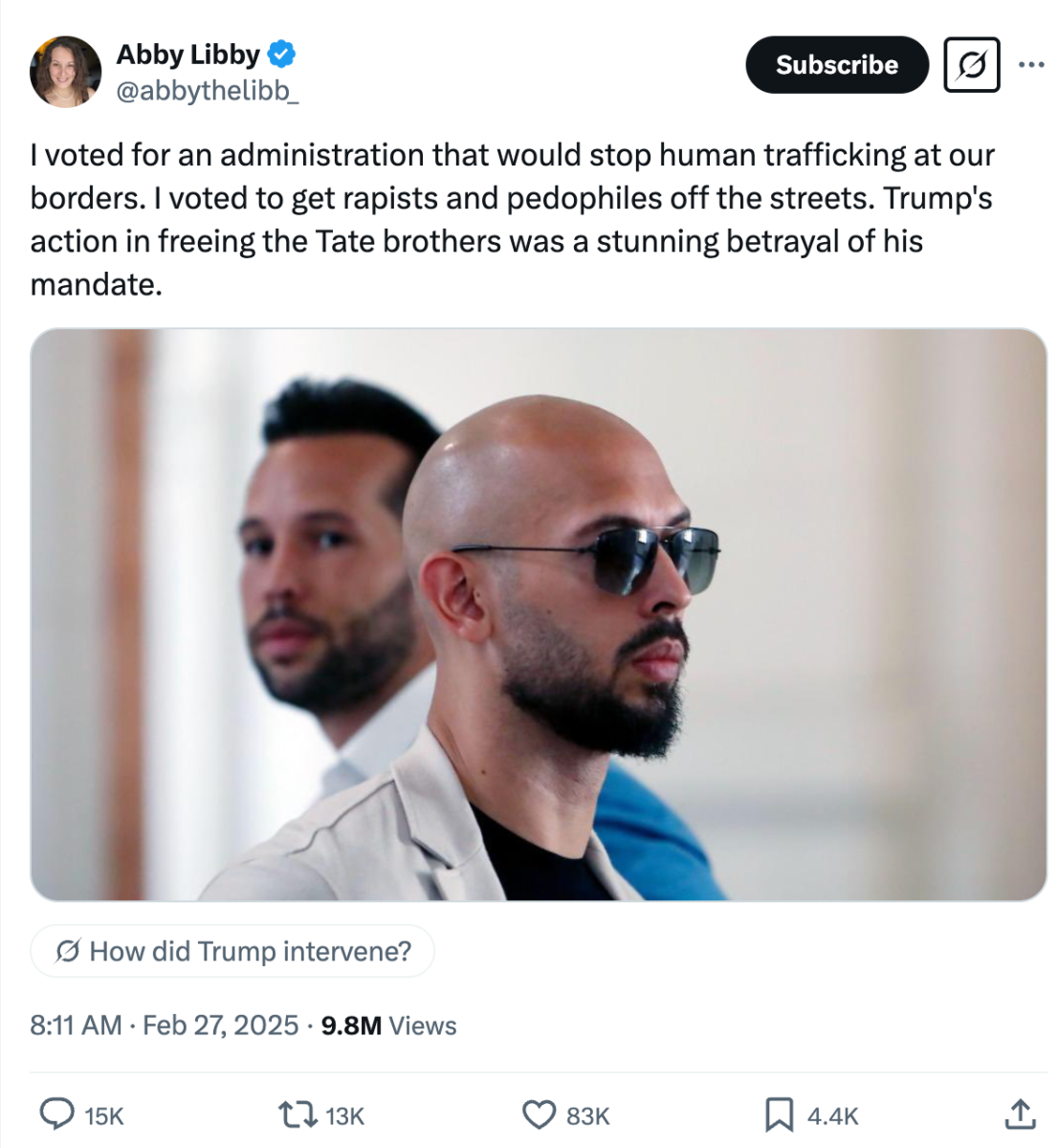 The minute Trump started floating the idea to free the January 6 rioters, he sent a clear message to all Americans: if you’re pro-Trump, you’re above the law. All his supporters, from DeSantis to Shapiro to Libby, knew this when they voted for him. They also know that they were setting a terrible precedent for men accused/convicted of sex crimes to evade justice by voting a sexual abuser into office. So, yes, they did vote to turn America into a sanctuary for people like the Tates, so long as they’re chummy with Trump. They weren’t blindsided, betrayed, or surprised as they claim, nor are they absolving themselves by claiming to oppose the Tates. You can’t vote for lawlessness and then feign surprise and dissent when the lawlessness happens.