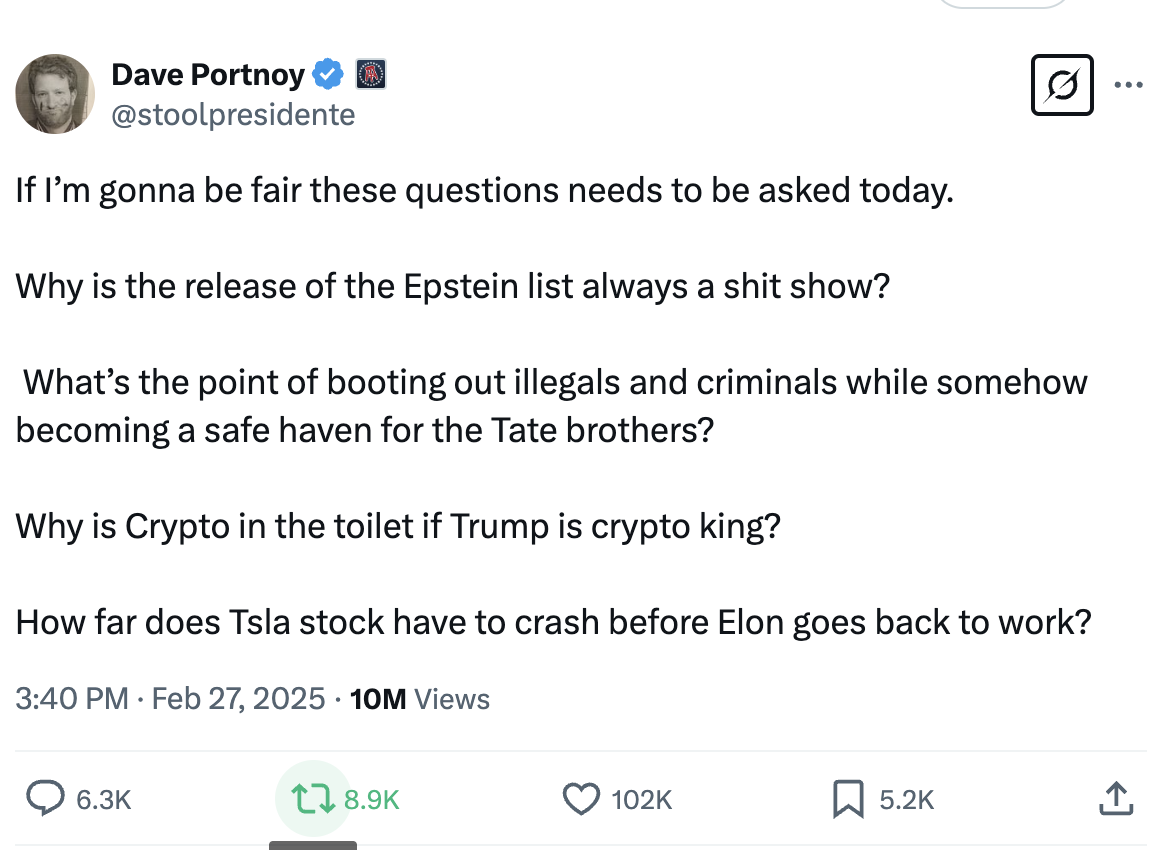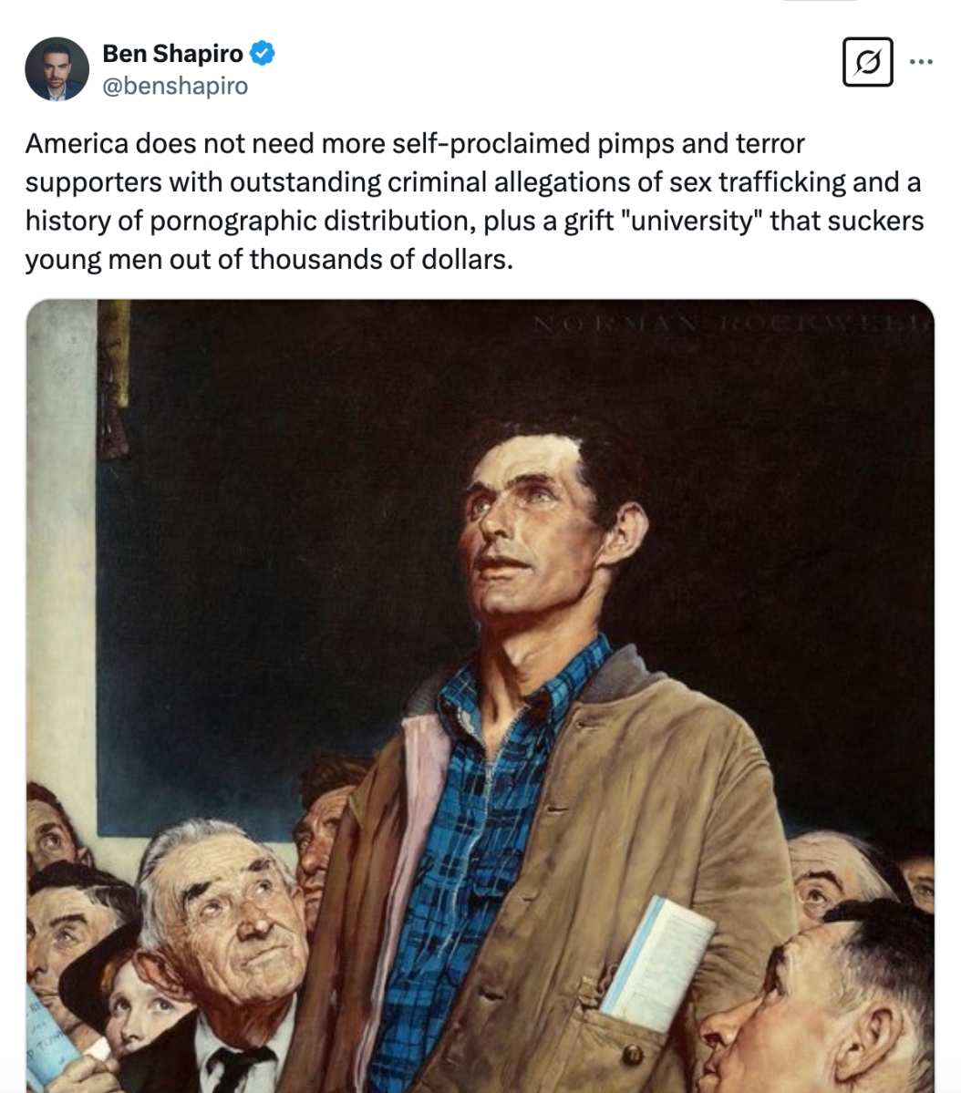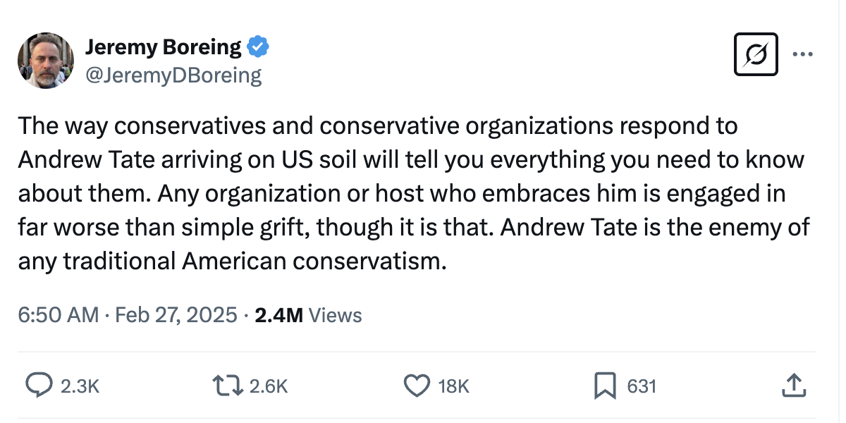 On X, numerous Trump supporters and fans slammed the Tate brothers’ return to the U.S. Trump fan and Barstool founder Dave Portnoy asked, “What’s the point of booting out illegals and criminals while somehow becoming a safe haven for the Tate brothers?” Daily Wire founder and professional manbaby Ben Shapiro also noted that America doesn’t need “self-proclaimed pimps and terror supporters with outstanding allegations of sex trafficking,” while his Daily Wire co-founder Jeremy Boreing condemned any conservatives who embrace the Tate brothers.