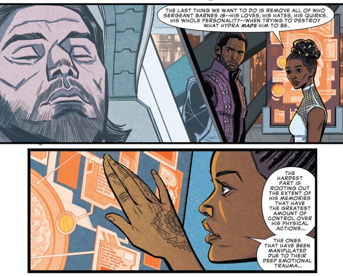 So if Marvel’s comics work as canon filler for the movies, Shuri developed a procedure to help Bucky between the events of Civil War and Infinity War. (When she quips that T’Challa has brought her “another broken white boy to fix” with Agent Ross, the first was Bucky.)