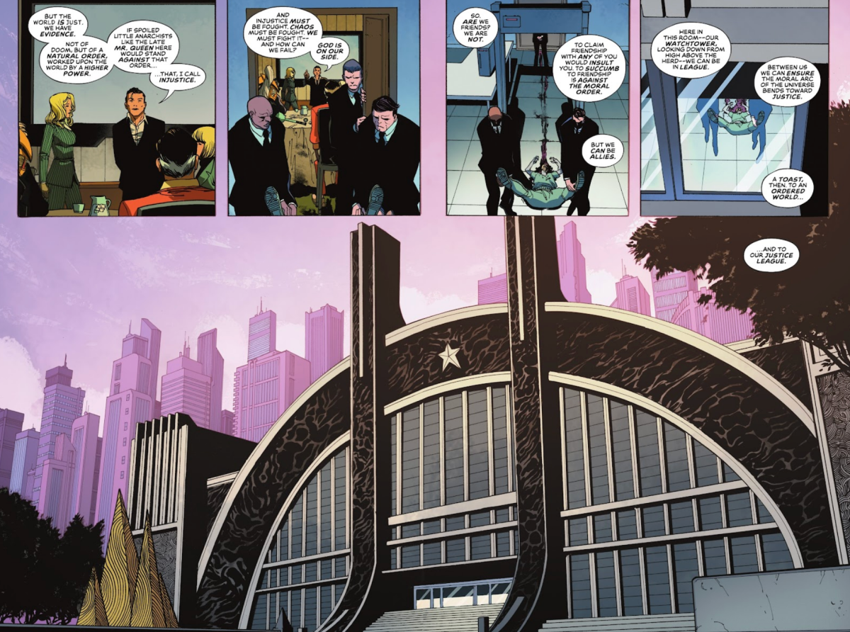 The meeting accomplishes many things: Joker reveals his particle accelerator has discovered the “Omega Particle”, which is a key part of Darkseid’s influence on the world; and the villains eventually realize that they might be stronger together than alone. Part of what convinces them is genuinely shocking: Cale has Hawkman (suited up in a macabre version of his Hawkworld-era costume), bring in the corpse of Oliver Queen, a businessman and wannabe-vigilante who he has assassinated. As Oliver’s corpse rests on the table in front of them, the group agrees to join forces… as a “Justice League,” complete with their own Hall of Justice.