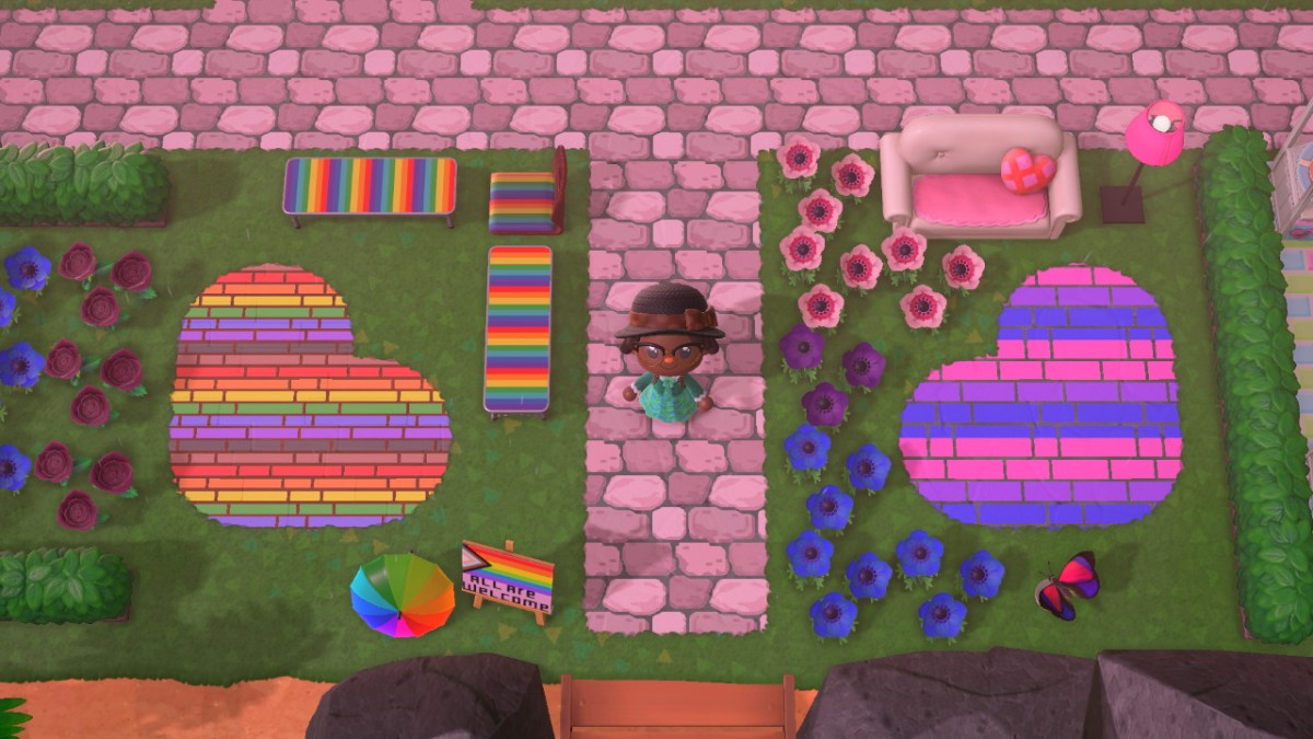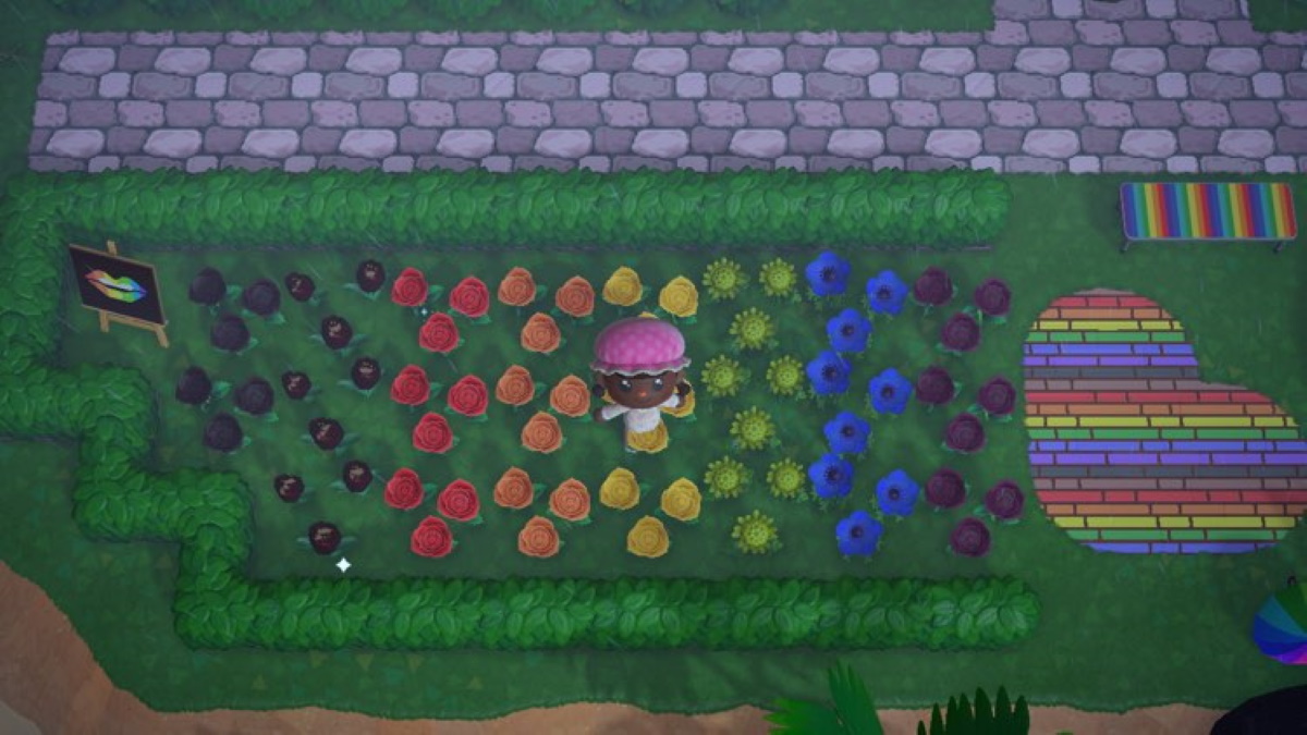 When I got the ability to make custom designs my immediate goal was to make parts (or all) of my island as gay as possible. First came the hearts, then came the galaxy brain moment of making a rainbow out of the flowers. Thanks to some friends who’d already done a ton of gardening on their islands, I got to make my entrance faster than I expected.