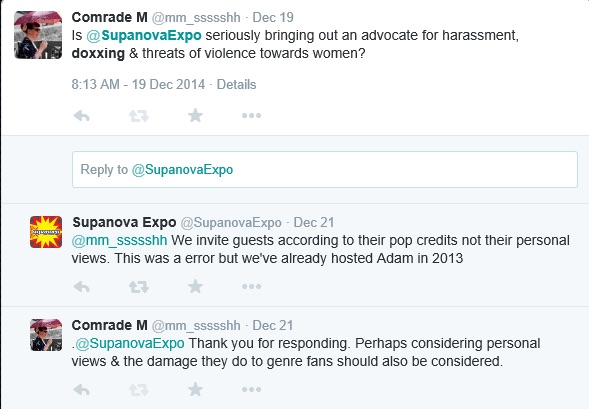 One thing you have to understand about the Australian con scene is that it is tiny. Aside from a few niche events for Anime fans and cosplay enthusiasts, we have two major brands that travel the country: reedpop’s Oz Comic Con, and the family-operated Supanova Expos. So when you announce a guest, that may be the only chance you have to see them that year, maybe two, maybe ever. They basically set the atmosphere for the entire event. For example, John Barrowman (bless his heart) came out for the same event last year; every line was full of Whovians, Arrow fans, and fans of sass. So it’s not a long bow to draw to say that if they announce someone who has often been touted as the architect of Gamergate, to draw like-minded individuals. And how the presence of someone that may be triggering, plus those like-minded individuals, would create a toxic environment for many attendees.