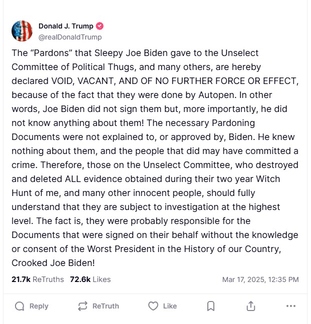 The premise of Trump’s argument stems from the thought that autopens couldn’t be used to sign pardons. Despite this claim, it’s unclear whether Biden used an autopen to sign the document. Not that it would have mattered, because a president’s manual hand signature isn’t required for an official pardon.