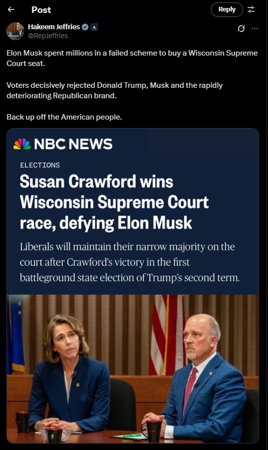 Minority Leader Hakeem Jeffries also lauded Crawford’s win online. He shared on X, “Elon Musk spent millions in a failed scheme to buy a Wisconsin Supreme Court seat. Voters decisively rejected Donald Trump, Musk, and the rapidly deteriorating Republican brand.” Crawford’s win keeps Democrats at a lead in the Wisconsin Supreme Court at 4-3. The next Wisconsin Supreme Court election is set for April 2026.