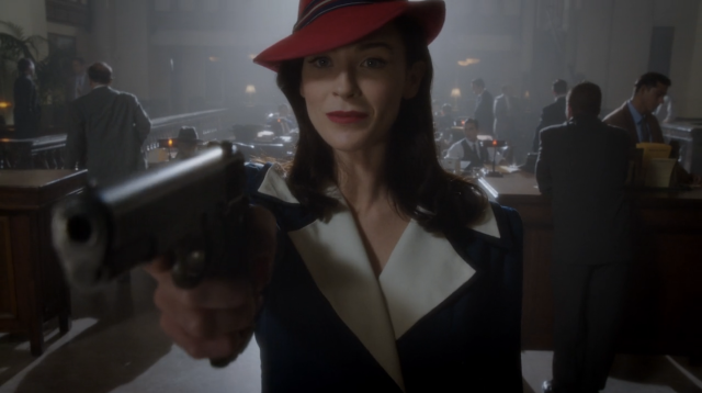 The season premiere kicks off with Dottie in her best Agent Carter cosplay, holding up a bank. She looks good as a brunette, even if this is a stick-up. Except somehow Peggy is hiding inside the bank vault, with a shotgun: “Dorothy Underwood, you’re under arrest.”