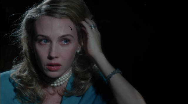 Back to Peggy vs. Dottie: Interrogation Room Edition. Dottie had possession of a mysterious lapel pin that Peggy seems to think is a key of some kind, although of course Dottie’s not going to open up about it. What’s weird is that Peggy seems to be playing good cop here, gently smiling and removing Dottie’s handcuffs, assuring her, “I am not afraid of you.” Seems like Peggy’s trying to lull Dottie into a false sense of security. Is that really going to work?