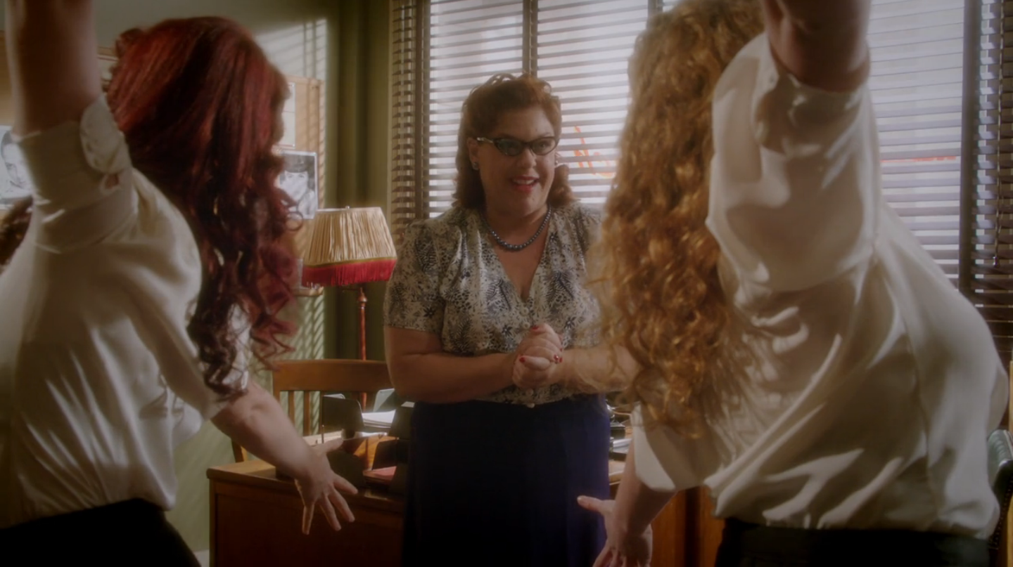 Next up, we re-meet another character from the first season, although she might have a larger role this time around — it’s Rose Roberts, who used to help with the “phone company” front for the SSR. The new front for Sousa’s LA office is “The Auberbach Theatrical Agency.” Somehow, two over-enthusiastic tap dancers managed to find the place and have insisted on auditioning; Rose turns them down politely before showing Peg inside.