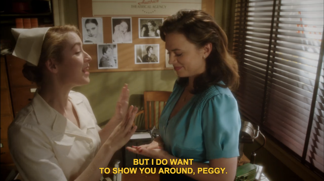 Rose and Sousa are heading to work together, and Rose is pressuring Sousa to tell Peggy that he has a new girlfriend. Once they arrive at work, Sousa discovers that Peggy and his girlfriend have already met – and they’re already getting along. It seems like the theme of this season is Peggy refusing to be competitive with other women, no matter what society may expect. And I LOVE IT.