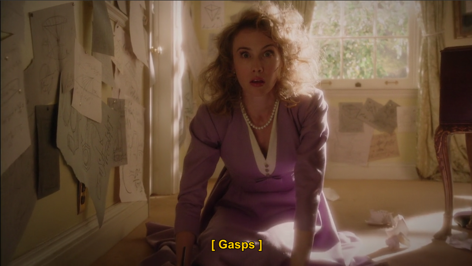 While Joseph and Whitney interrogate an underling—a guy who has no idea why he’s being questioned, by the way—Peggy and Sousa sneak into Whitney’s bedroom and snap a bunch of pictures of the designs. (Sousa also manages to take a picture of Peggy while they’re in there—a “souvenir” from her trip to California. I guess these two can be kind of cute sometimes, but also get back to work, Sousa! The clock is ticking here!)