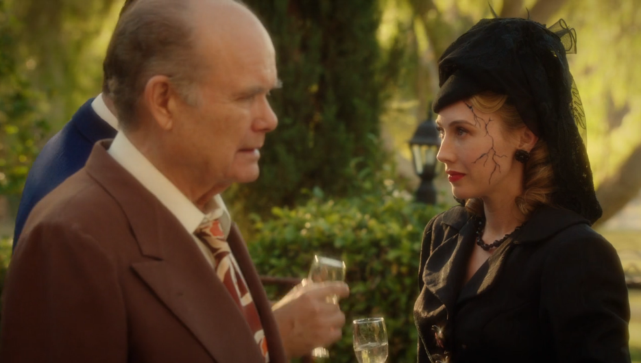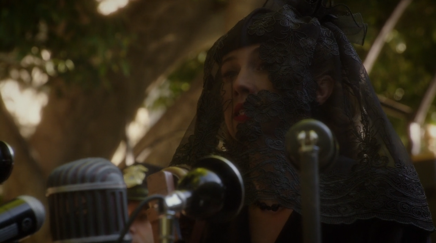 Whitney Frost has found yet another fashionable way to hide her zero matter facial scars – in this case, a widow’s veil, worn to a press conference about her husband’s unexpected death. Reminder: she’s the one who killed him.