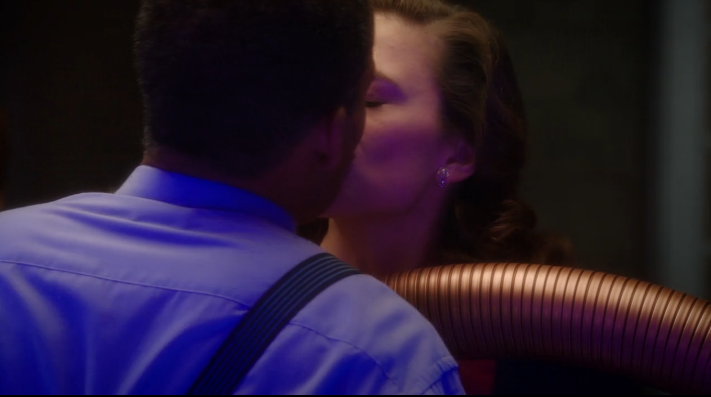 Back at Stark’s estate, Jason hops into his containment chamber and Jarvis turns it on. Peggy gives him the zero matter sample; he absorbs it into his hand so he can become tangible. It seems as though the chamber works – but is he stuck inside it for life? He reaches his hand through one of the gaps to grasp Peggy’s hand – then pulls her in for a kiss. Yayyy!