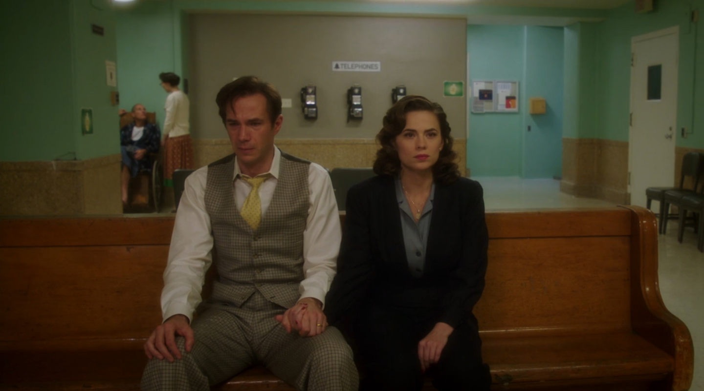 Peggy calls Sousa from the hospital, but when Vernon picks up the call, she hangs up without speaking to him. She then sits down next to Jarvis, who looks like a wreck. He tells Peg that Ana is still in surgery. I just realized that the two of them might not realize that Jason has been kidnapped – do they know that yet? Doesn’t matter quite yet, since Ana’s situation seems a lot more dire … Peg reaches out and grabs Jarvis’ hand just before the credits roll.