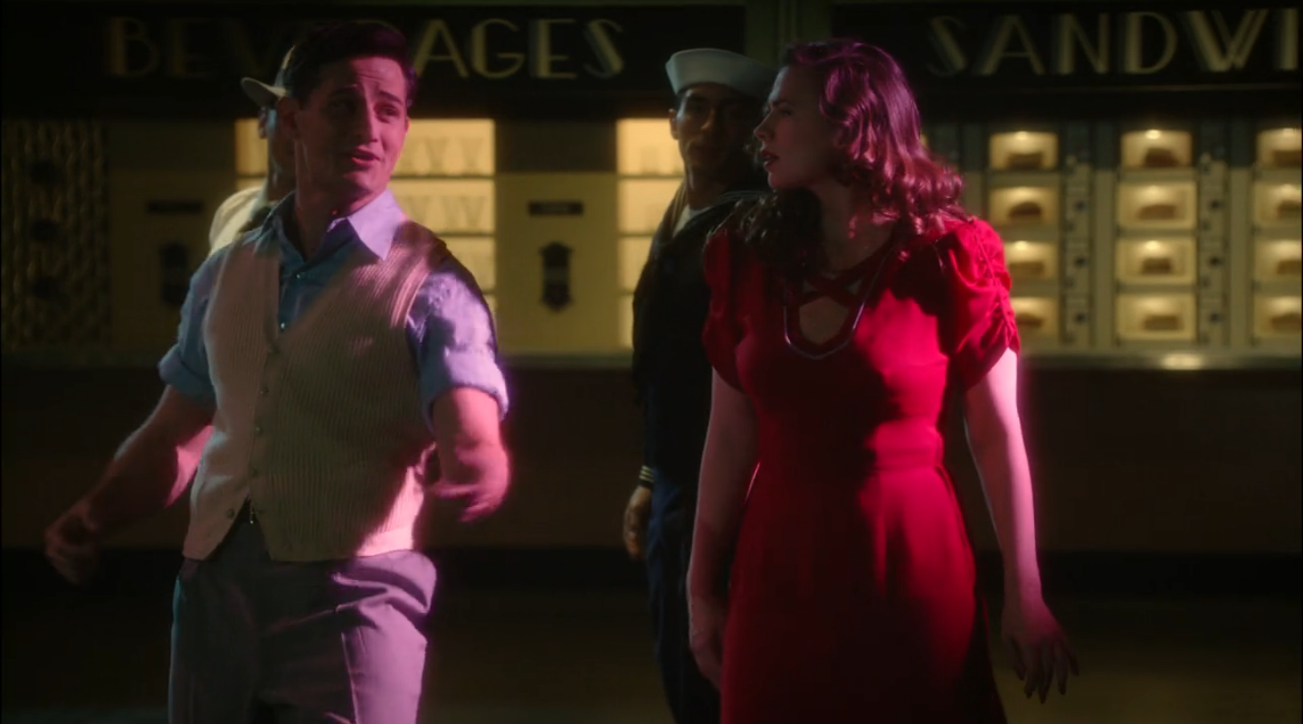 I normally can’t abide musical episodes of television – I love musicals, but usually stuff like this feels too forced and corny to me. When this began, I thought I was going to hate it – but I admit, it ended up winning me over. The music fits the time period, and the dancing was fantastic. Plus, it was only a couple of minutes in length, so it felt like just the right amount of time for a non-canonical dream sequence, while still highlighting everything going on in Peggy’s head.