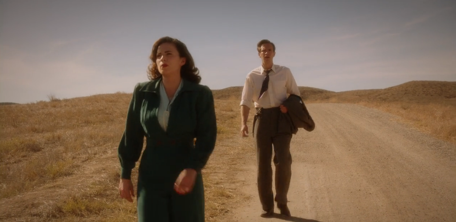 Peggy and Sousa are supposed to be back-up, tailing them in a separate car. Except their car has been sabotaged … by Jack, probably, although Peg assumes Vernon did it. Does it even matter which of them did it? They’re both jerks. Anyway, Jack doesn’t respond to Peggy’s radio call about the car, so it was probably him.