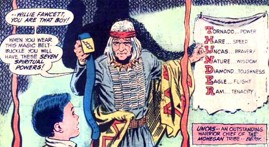Maggin and Schwartz decided that the solution was to introduce a counterpart for Billy who fit into the DC Universe. So in Superman #276, Elliot S! Maggin introduced a young boy named Willie Fawcett (get it??) who was given a magical lightning talisman attached to a belt. Wearing the belt, he shouted the word “Thunder” and was transformed into a champion by a magical starburst making a “Sha-Boom!” sound. As Captain Thunder, Willie gained the power of the Tornado, the speed of the Hare, the bravery of the Mohegan warrior chief Uncas, the wisdom of Nature itself, the resiliency and toughness of a Diamond, the flight of the Eagle, and the tenacity of the mighty Ram.