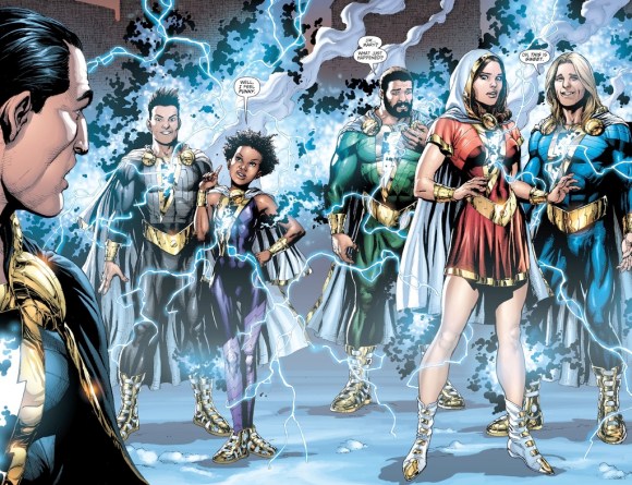 During his origin, Billy was able to share his power with the other foster kids who lived with him, creating a new version of the Shazam family who then helped him kill Black Adam (though he resurrected a few months later). These are some fun looks, but I do object to Freddy Freeman being blond and no longer resembling Elvis. That just feels wrong. I’m also not sure why Mary has different boots than the others and I still find it problematic having a flying character in a skirt. Ah, well. Darla looks pretty great in her purple get-up, doesn’t she?