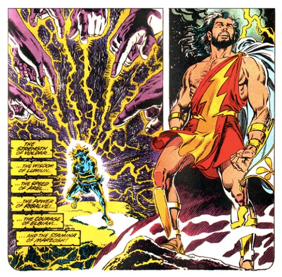 Speaking of characters from ancient times, we finally got to learn the origin of the wizard Shazam in “The Captain Marvel of 7,000 BC,” published in World’s Finest Comics #262 in 1980. Written by E. Nelson Bridwell and drawn by Don Newton, this story had the young Shazam, calling himself “Champion,” journey into the future and recruit Captain Marvel’s help. We learned that he too was really an adolescent boy who transformed into a hero with a magic word, in his case “Vlarem” (an anagram for “marvel”). This referenced his abilities: the strength of Voldar, the wisdom of Lumiun, the speed of Arel, the power of Ribalvei, the courage of Elbiam, the stamina of Marzosh. Together, Captain Marvel and Champion actually created the Rock of Eternity that would serve as Shazam’s base thousands of years later.