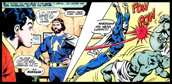 A couple of years later, DC said “screw it” and had Superman and Captain Marvel cross dimensional barriers to meet for real. On the covers for most of these stories, he was simply referred to as “Shazam” as if that were his name. This began a trend where both readers and people not totally familiar with Billy would just call him “Shazam” rather than “DC’s Captain Marvel, not Marvel’s Captain Marvel.”