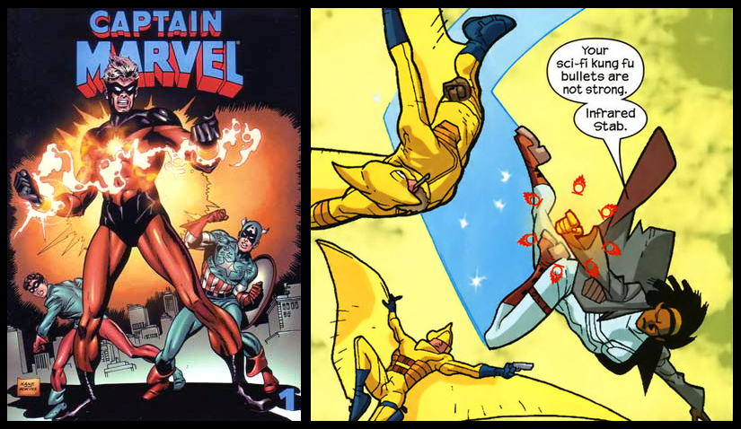 The next year though, a new Captain Marvel appeared: Genis-Vell, son of Mar-Vell. Though Genis had no problem with Monica using the name Captain Marvel, she conceded the title to him since it had been used by his father first, and more and more people were calling him by it anyway. I can’t help but think about what it means that Monica never got her own series, despite her popularity and years as a hero, yet Captain Mar-Vell’s son got one almost immediately and was given his dad’s code name even though it was already being used. Food for thought there.