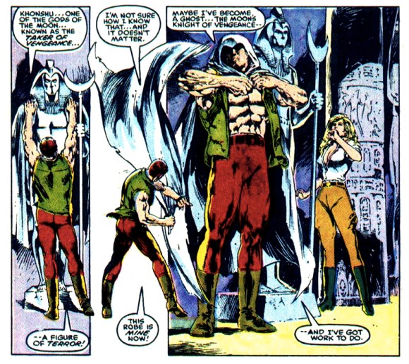 Though Doug Moench scripted this new origin, it came about through conversations and shared input between him, editor Jim Shooter and editor Denny O’Neil (who would later become the head editor of Batman for many years). According to O’Neil, he thought of the scene of Marcdying in front of the statue of Khonshu in a tomb and then reviving moments later, while Shooter and Moench figured out the rest.