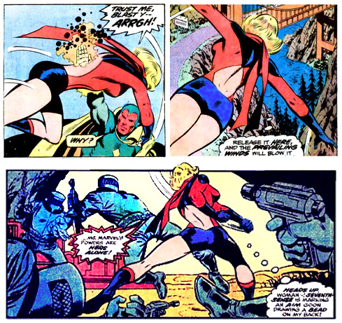 This costume is pretty killer. Alas things didn’t work out too well for Carol soon afterward. Her series was cancelled and then she showed up in an Avengers story where she was taken hostage by Marcus, son of the cosmic time villain Immortus. Carol was then returned to Earth, impregnated with a baby that rapidly grew into a new version of Marcus. The guy explained that he and Carol had a love affair in his other dimension, where time moved differently, and that this had enabled him to continue his lifespan in a new way. He also admitted that initially Carol wasn’t down for romance, so he’d given her a “subtle boost” from technology he had that could affect minds. Carol then went off with Marcus to live happily ever after and the Avengers wished her well.