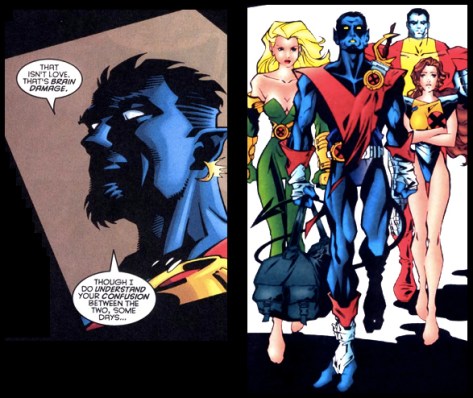 Along with this, Chuck Austen revealed that Christian Wagner was not Kurt’s real father because Mystique had cheated on the guy with Azazel, a guy who looked just like Nightcrawler but red. Azazel was leader of a tribe of demonic mutants who shared genetic traits for some weird reason, inspired legends of demons, inhabited the smokey dimension that Kurt used to teleport, and hated another tribe of mutants who apparently all looked like angels, inspired angelic myth and included the ancestor of the X-Man called Archangel. Azazel, by his own account, was the inspiration for stories of Lucifer. This doesn’t really make sense when you consider that actual demons and angels do inhabit the Marvel Universe.