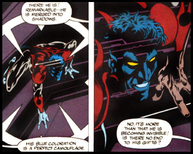 Over the years, this power was seldom used. It got to a point where it seemed that only Claremont and writer/artist Alan Davis ever remembered Nightcrawler was able to become invisible in the right light and didn’t just blend in with shadows because of his indigo fur and largely black costume. It’s basically a forgotten ability now, much like how X-Men’s Gambit was once said to have a hypnotic charm ability which made you trust him but then it wasn’t mentioned for years.