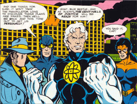Charlton Comics stopped publishing superhero comics in the 1970s. In 1983 AC Comics published a story introducing the Sentinels of Justice, a team composed of the Question and fellow Charlton heroes Captain Atom, Nightshade, and Blue Beetle. In this adventure, the Question wore a trenchcoat rather than an overcoat, which I think suits him better. This incarnation of the Sentinels of Justice never had a second adventure.
