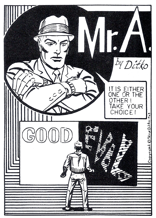 Mr. A was inspired by Ayn Rand and her philosophy of objectivism, Ditko having become a fan of her work over the years. Her influential book Atlas Shrugged was published just ten years before Mr. A was created. Rand once said: “There are two sides to every issue: one side is right and the other is wrong, but the middle is always evil.” Similarly, Mr. A used a calling card that was half-black and half-white, saying there was good and evil and nothing in between. People who believed otherwise and spoke of shades of gray were people who invited the corruption of evil into their lives.