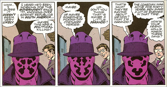 Rorschach didn’t use chemical and gas agents like the Question did, but he did don a trench coat, suit, and fedora along with a mask that completely disguised his features. The black and white designs on the mask that constantly alter but never mix or become gray recalls Ditko’s Mr. A.