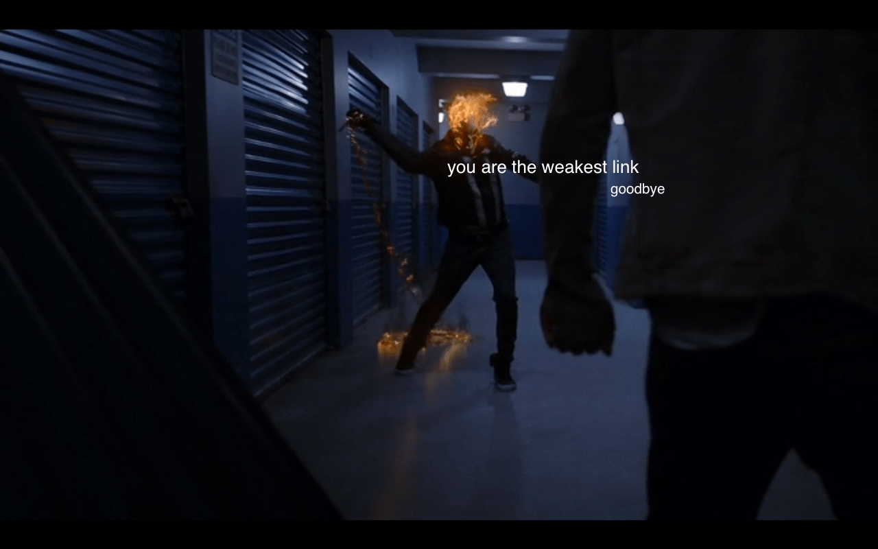 Daisy and Simmons end up running into Coulson and Mack, and all of them end up fighting off the Watchdogs, who were still trying to chase Daisy down. Robbie, all Ghost Rider’d out, backs James into a corner. James ends up breaking through the wall behind him, dropping them both into the fireworks shop next door.