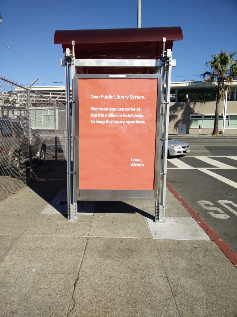 Over the past week, a series of terrible passive-aggressive ads have shown up on San Francisco’s bus shelters, all signed “Love, Airbnb.” They appear to be calling out the city’s publicly-funded services such as the public library, the bus system, and the department of public works.